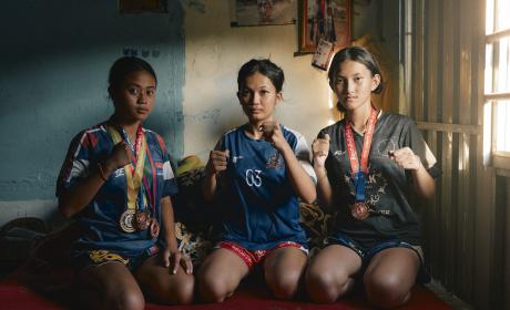 Le bruit sec des sacs de frappe rythme l’échauffement. Vanda, Souannita et Dalin, 18, 14 et 17 ans, s’entraînent chaque jour à quelques kilomètres de Phnom Penh, dans une salle en plein air. Le père de Vanda, ancien boxeur de kun khmer, forme gratuitement les jeunes du village, « J’ai commencé avec ma fille, puis les autres sont venus ». Ici, peu de confort : baraques en tôle, dortoirs partagés. Souannita combattra bientôt au festival de l’eau. Comme beaucoup de jeunes cambodgiennes, elle rêve d’échapper à la pauvreté grâce à la boxe, sur les traces de Sam Taroth, star nationale et figure d’émancipation.