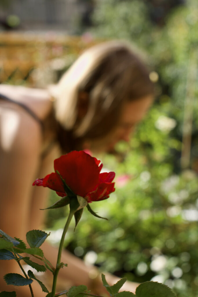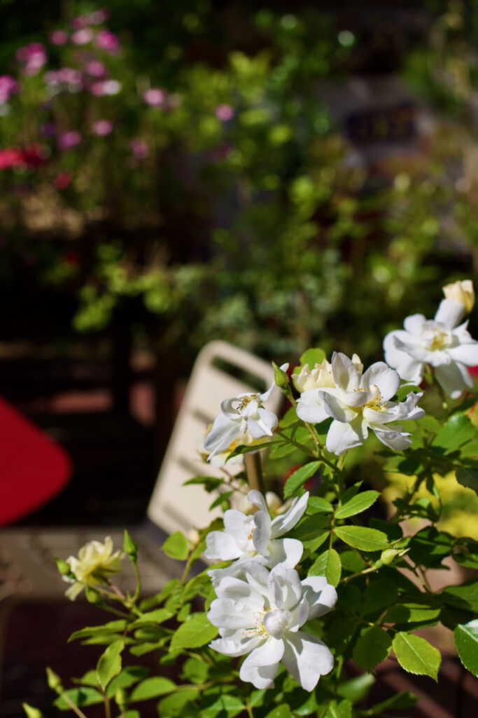 Ceux qui nous ont déjà rendu visite l’ont probablement remarqué : quelques rosiers poussent dans notre jardin… Non seulement elles sont très jolies, mais elles répandent aussi leur merveilleux et doux parfum floral. C’est pourquoi nous les plaçons principalement autour des tables, afin que l’on puisse vraiment en profiter pendant que l’on se trouve dans le jardin. Mais le mieux est de venir nous rendre visite dans notre jardin par soi-même.