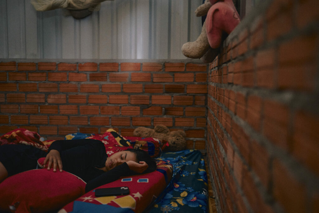 La jeune boxeuse est endormie dans sa chambre en pleine journée, après une nuit de travail à l’usine.