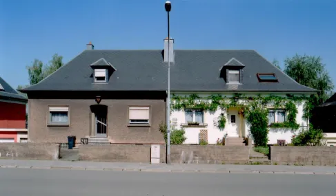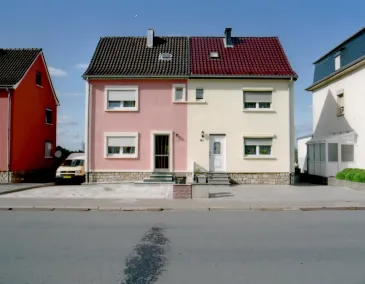 Les maisons jumelles luxembourgeoises captées par l’appareil photographique de Carlo Werner nous rappellent ces livres d’illustrations dans lesquels des personnages diversement costumés sont vus de face, l’image coupée en deux verticalement si bien que l’on peut soulever les volets pour créer des personnages composites dont les lignes s’ajustent avec tant d’exactitude qu’ils en deviennent monstrueusement cohérents. La démarche est bien ici celle d’une photographie documentaire inscrite dans la tradition de l’école de Düsseldorf, mais c’est comme si ces maisons jumelles étaient, dans le réel, des ready-made d’image comparative. De part et d’autre d’une ligne dont on observera qu’elle ne coupe pas toujours la maison à l’exact milieu, se déploie un Rorschach inégal, marqué par l’individualisme décoratif et des destinées divergentes, le motif avance parfois jusqu’au premier plan, habiter devient une question de limites et de séparations.
