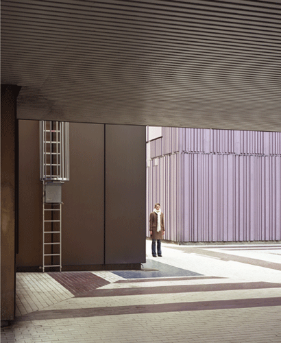 Les photographies d’Architectures constituent une série réalisée par Margaret Dearing en 2003-2005 sur le Front de Seine à Paris. Cet ensemble d’une vingtaine de tours situées sur une dalle en bord de Seine a résulté d’une opération d’urbanisme dans les années 70. Dans une lumière d’une froideur chirurgicale, chaque photographie déploie de larges aplats de couleurs, de textures lisses ou rugueuses, de brillances, de signes. On pourrait croire qu’ainsi l’image se réduit à deux dimensions en une sorte d’abstraction photographique mais il n’en est rien : un espace se dessine, se creuse, parcouru d’ombres et d’échappées, de perspectives suggérées et d’issues esquissées. La présence humaine n’est alors pas là pour évoquer un espace déshumanisé mais pour habiter la photographie à la façon dont les pionniers de la photographie, posant leurs lourdes machines dans les temples égyptiens, demandaient à un guide autochtone de poser à côté d’un portique effondré afin que cette silhouette humaine pût donner sa dimension aux demeures des dieux.