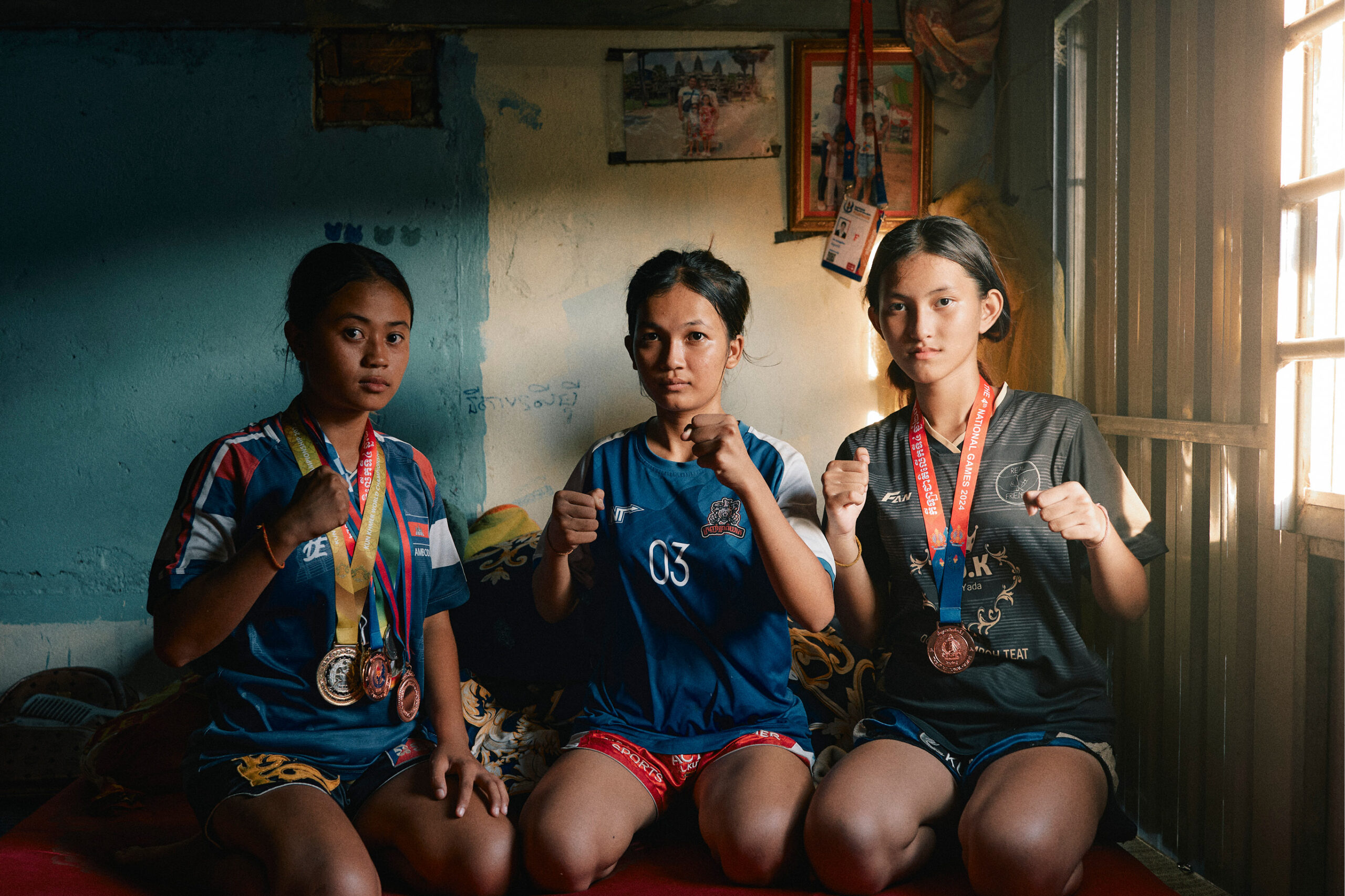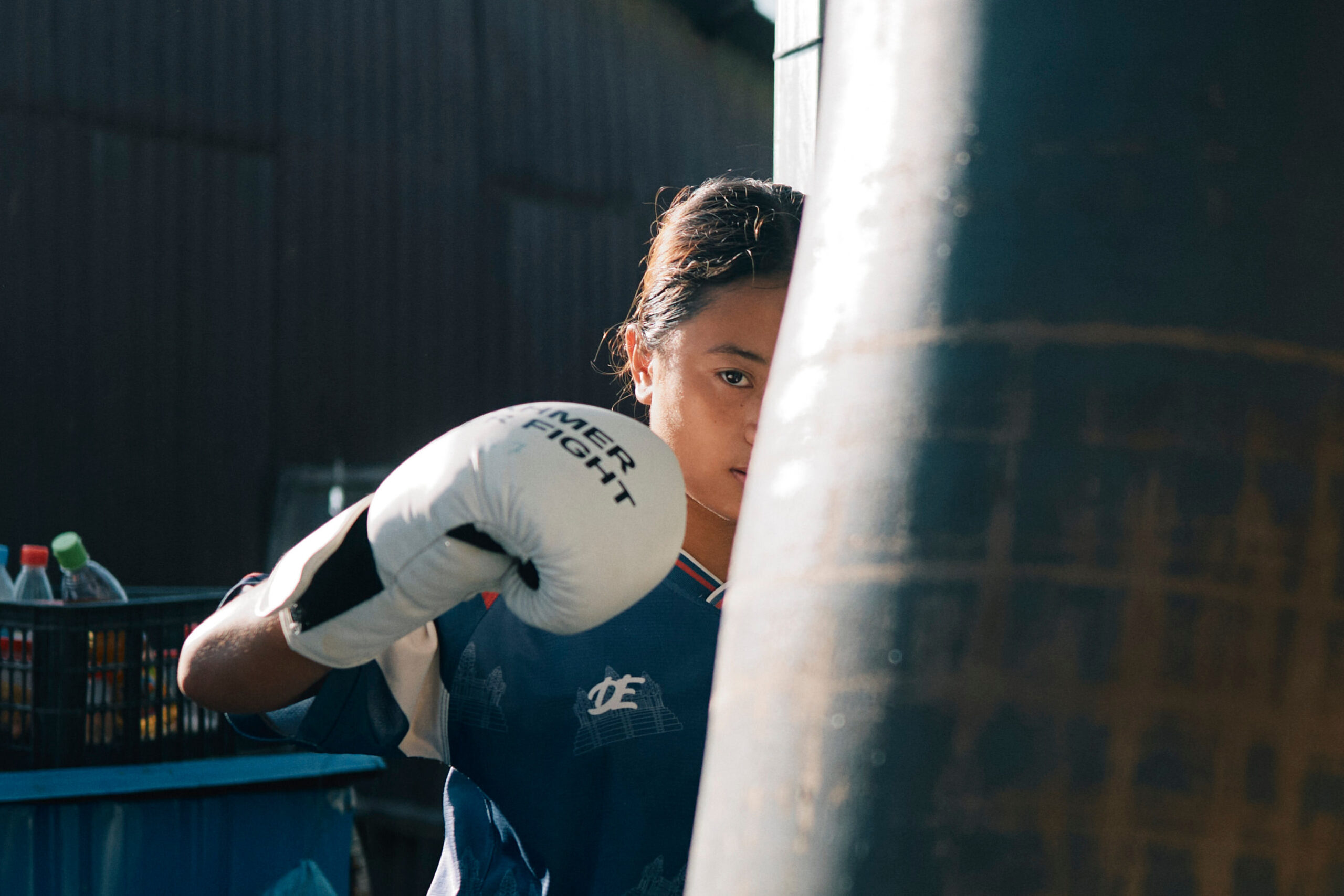 Le bruit sec des sacs de frappe rythme l’échauffement. Vanda, Souannita et Dalin, 18, 14 et 17 ans, s’entraînent chaque jour à quelques kilomètres de Phnom Penh, dans une salle en plein air. Le père de Vanda, ancien boxeur de kun khmer, forme gratuitement les