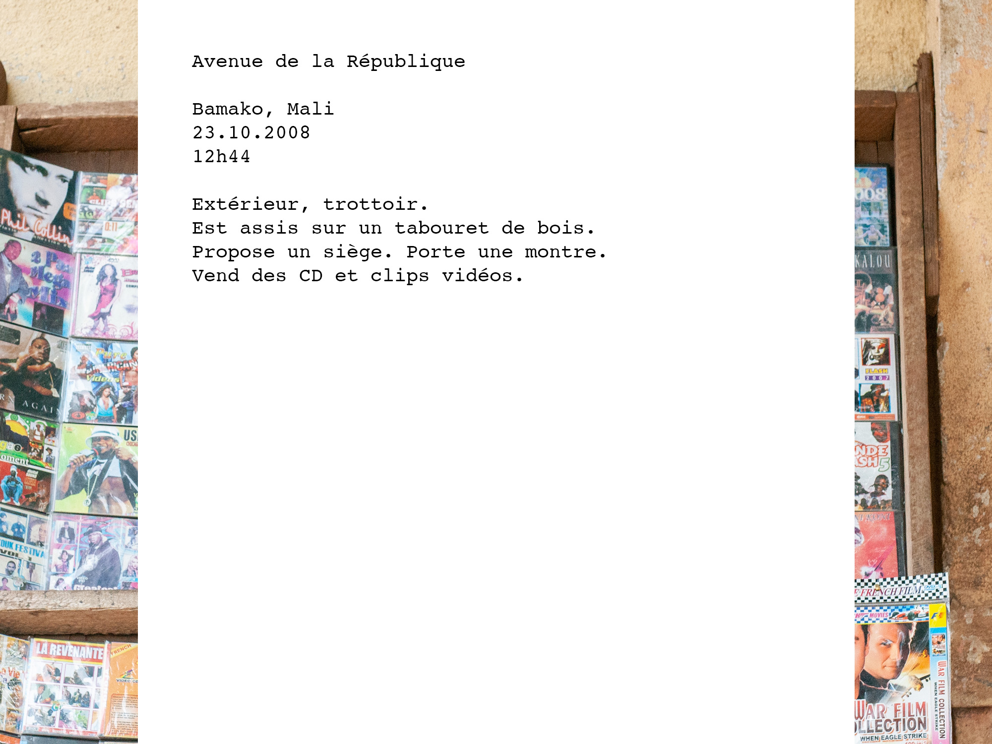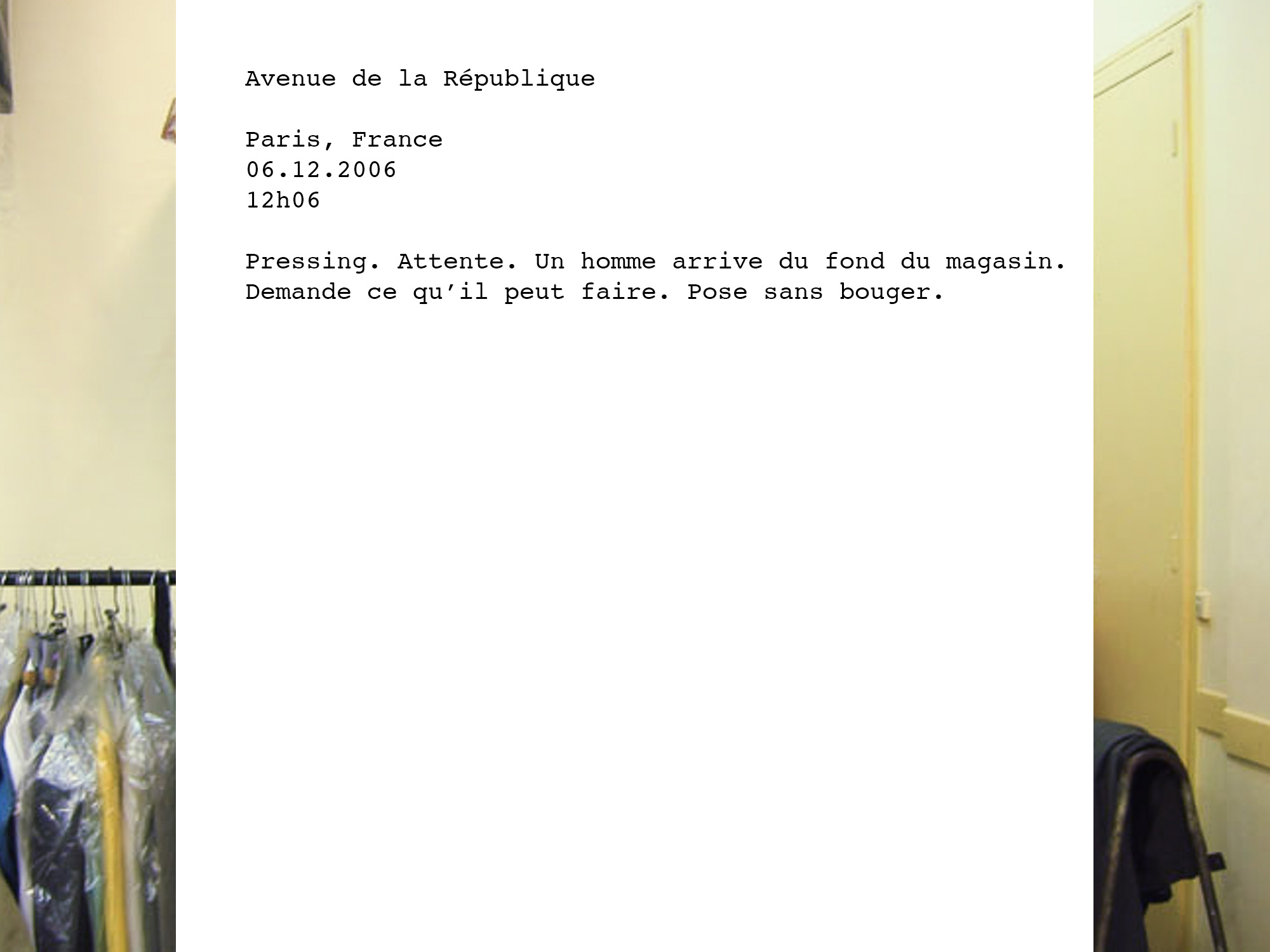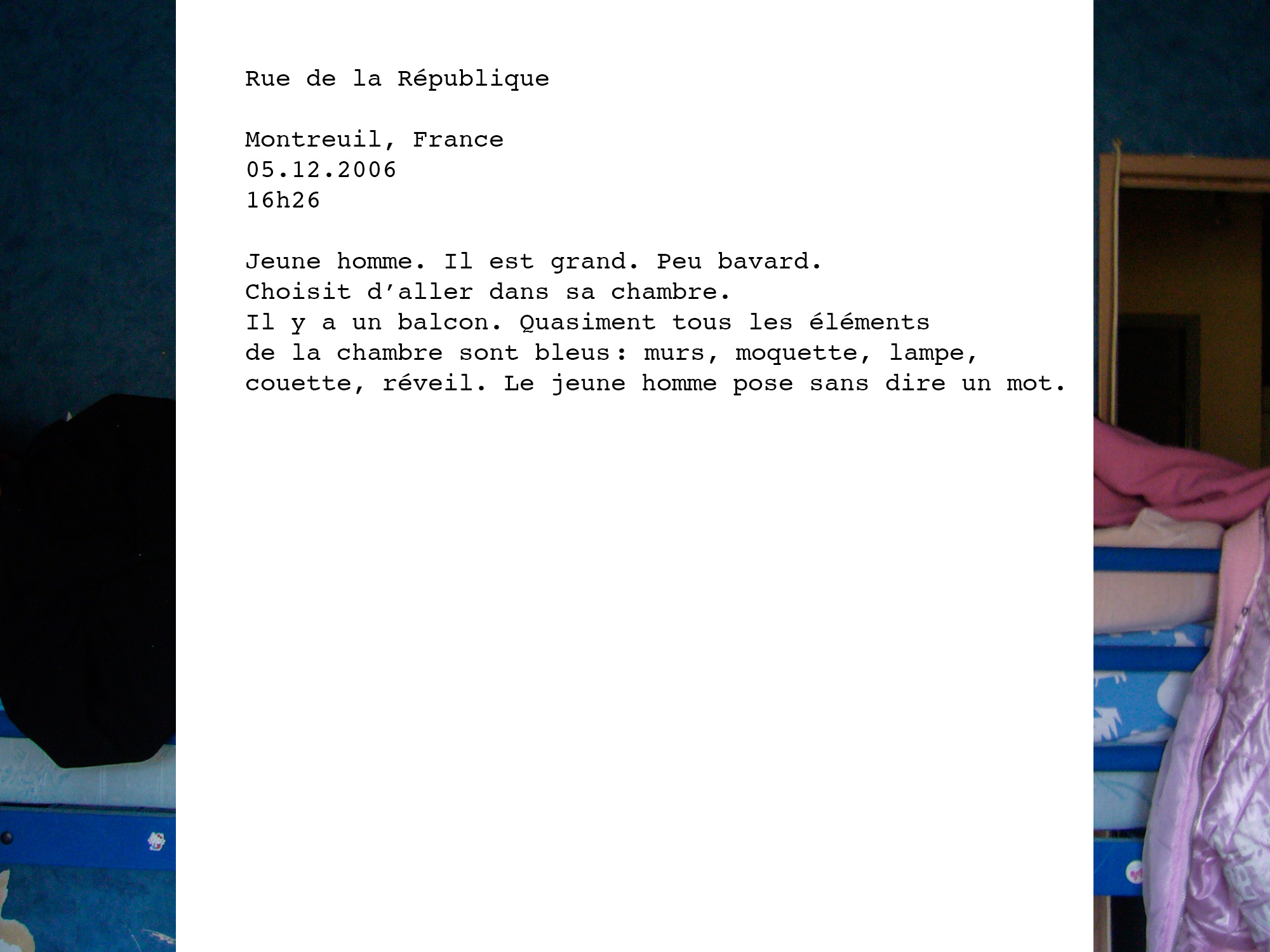 La République, du latin res publica, chose publique, est un des plus grands dénominateurs d’un peuple. La photographe a souhaité orienter son travail auprès de personnes vivant ou travaillant Rue de la République afin de représenter cette notion qui symbolise à la fois le collectif et l’individuel. Les entretiens se sont déroulés dans huit villes, choisies de manière aléatoire, dans des espaces privés (appartements) ou publics (commerces). Maureen met ici en évidence la diversité des individus et leur confrontation avec l’inconnu.