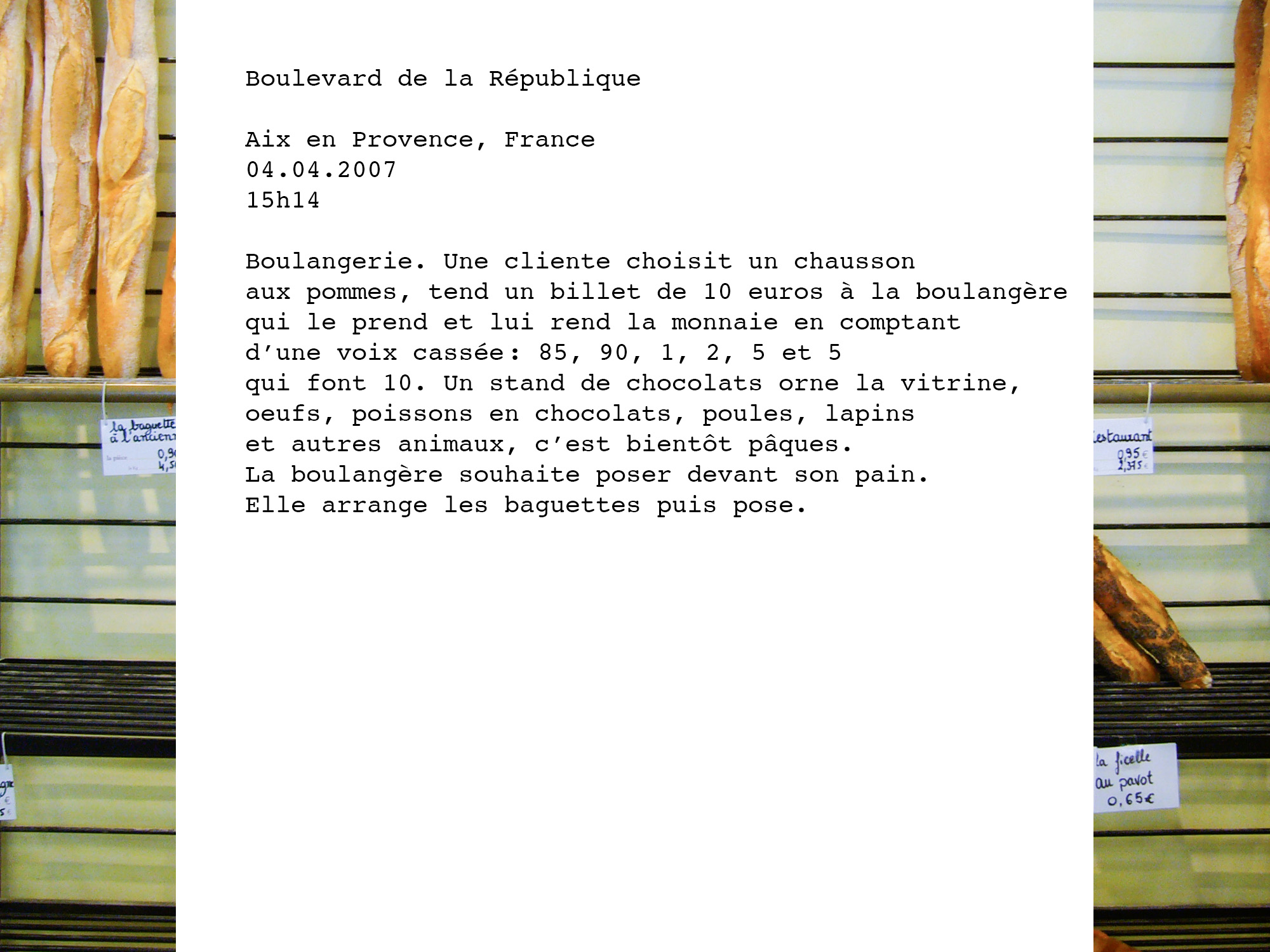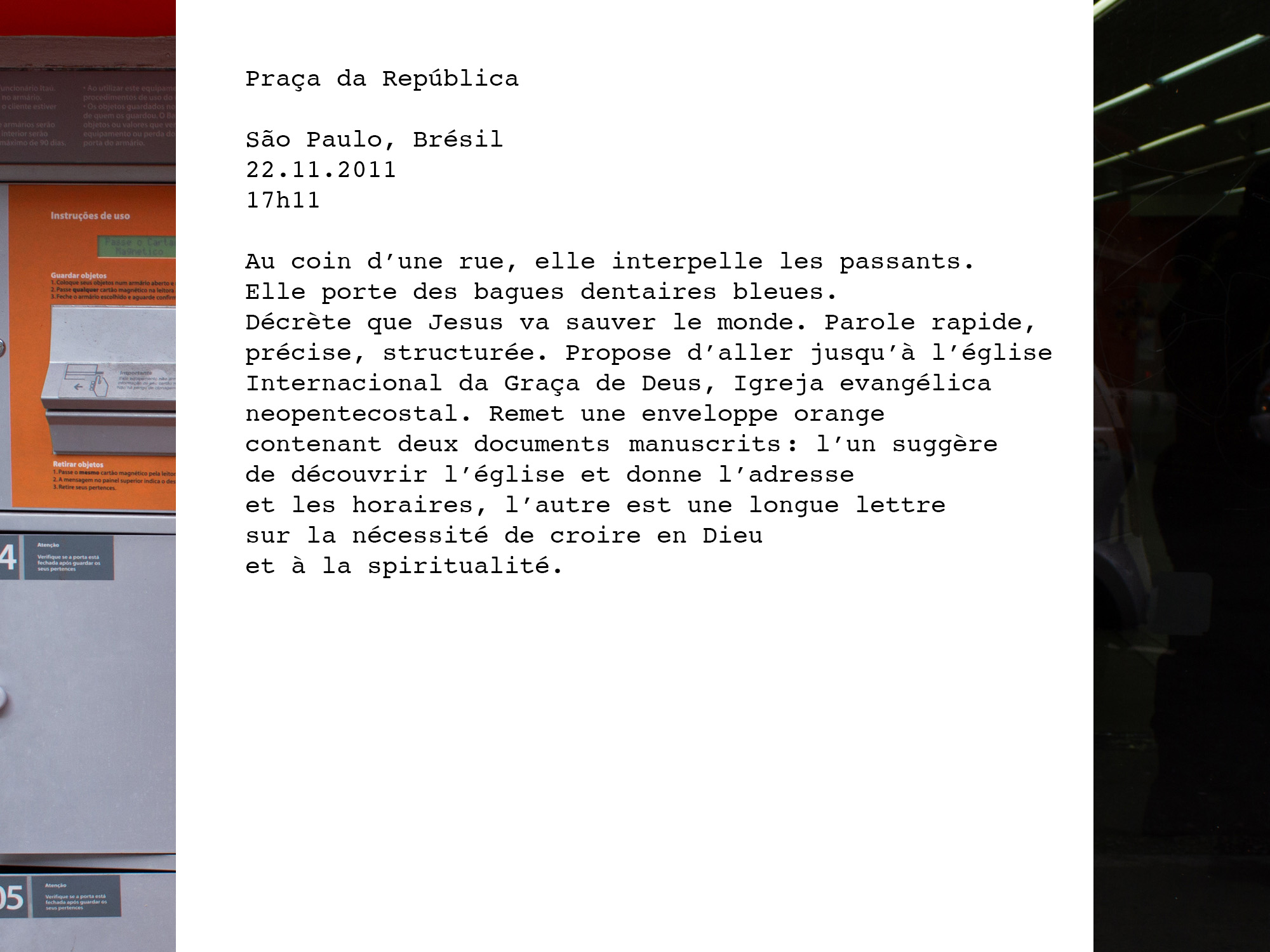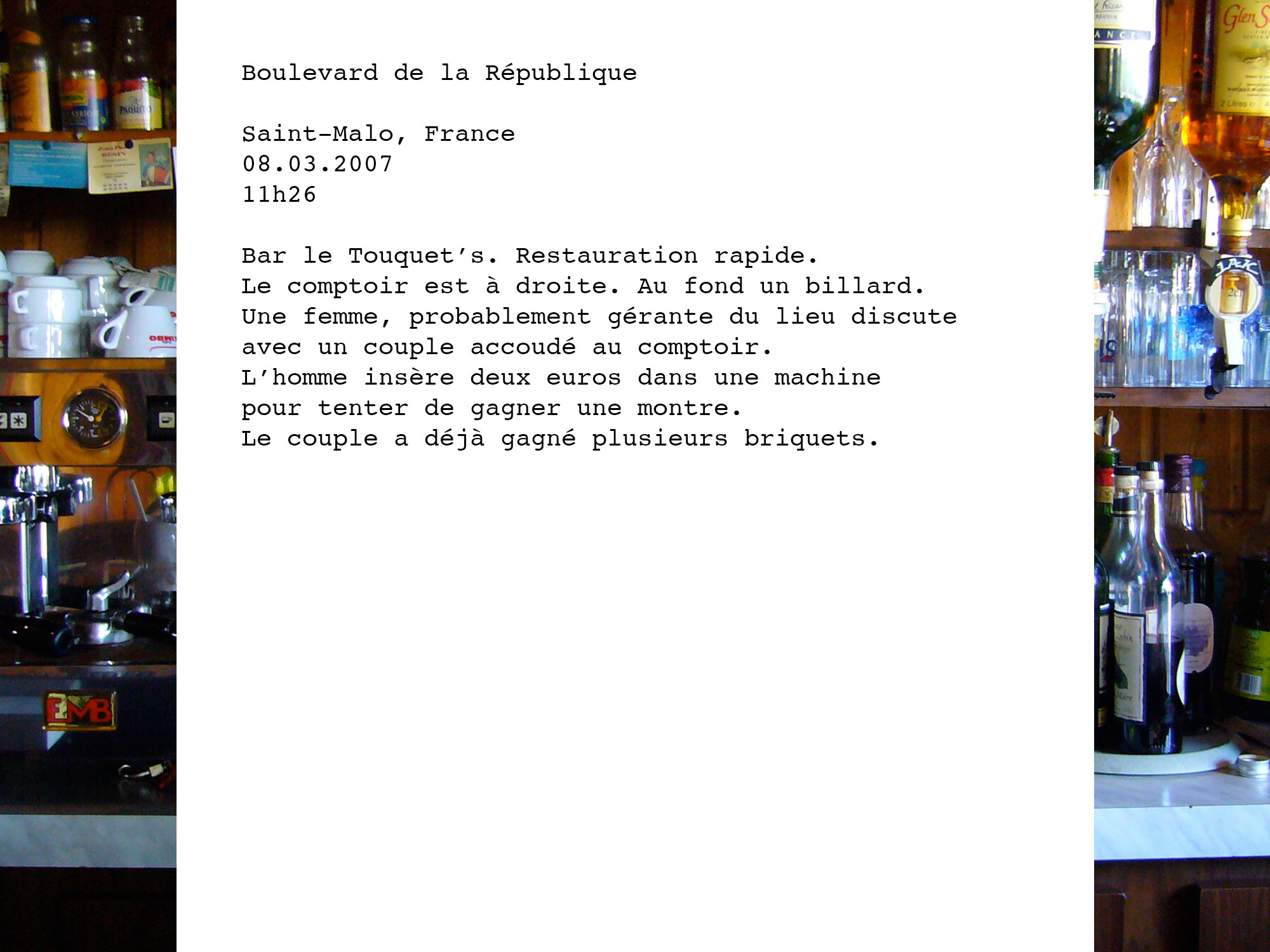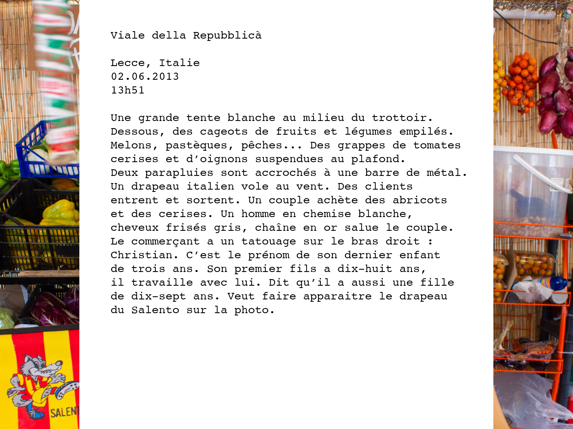 La République, du latin res publica, chose publique, est un des plus grands dénominateurs d’un peuple. La photographe a souhaité orienter son travail auprès de personnes vivant ou travaillant Rue de la République afin de représenter cette notion qui symbolise à la fois le collectif et l’individuel. Les entretiens se sont déroulés dans huit villes, choisies de manière aléatoire, dans des espaces privés (appartements) ou publics (commerces). Maureen met ici en évidence la diversité des individus et leur confrontation avec l’inconnu.